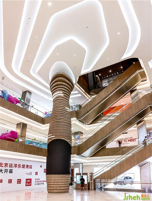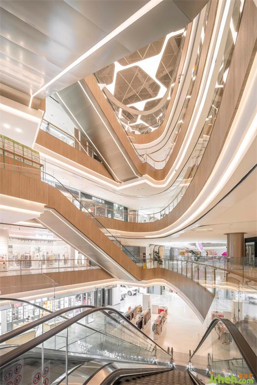 城市展廳以層疊漸退的形式,購物廣場設(shè)計(jì)將原有硬朗直線條調(diào)整為有一定弧度的方式,配合線型燈條的穿插增加柔美輕巧的流動(dòng)感。