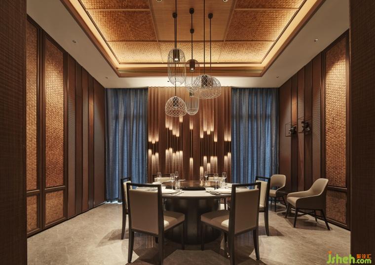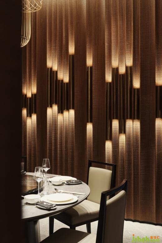 餐廳設計墻面巧妙融合了藤編與木雕技藝,配以仿藤編金屬網(wǎng)裝飾內(nèi)置木雕藝術作品,既彰顯了客莊鐵道文化與木雕藝術的獨特魅力,又凸顯了客家人宴客時的精致與考究。