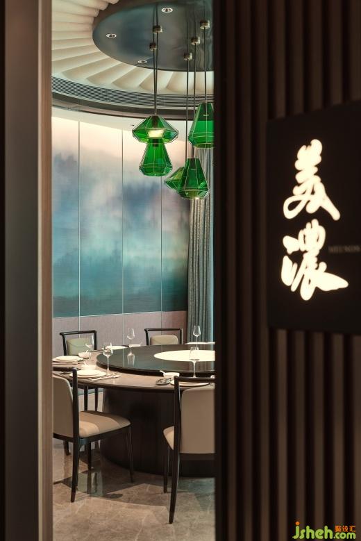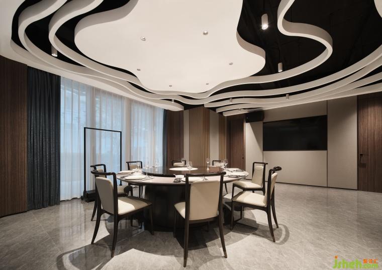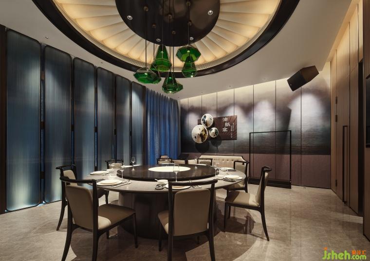 空間設計以油紙傘獨特的文化內(nèi)涵裝飾,傳遞吉祥、平安和團圓的美好寓意,山林意象的壁布環(huán)繞空間,如置身于美濃寧靜美好的自然風光之中。圓形天花吊頂巧妙地采用了透光材質(zhì)的組合,營造出傘面撐開的視覺效果,在燈光下展現(xiàn)出溫潤輕盈的光影效果。