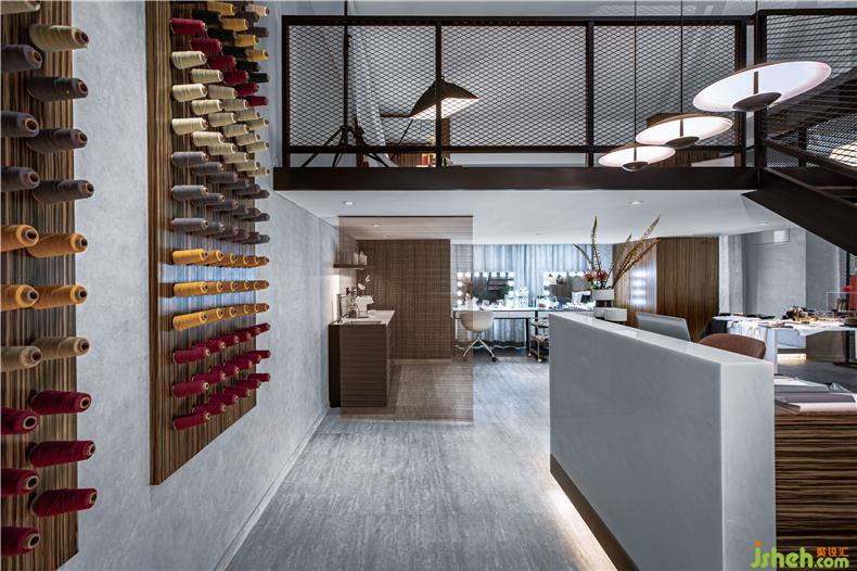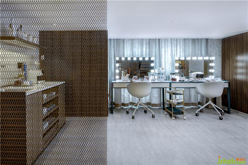化妝區(qū)和茶水間鋼絲網(wǎng)的設計是這個公寓在滿足整體工能布局的同時最巧妙的設計,室內(nèi)設計師進入工作是透過隔斷能夠看到化妝區(qū)的人物活動,同時隔斷又遮擋了屬于內(nèi)部展示的茶水區(qū)的設計