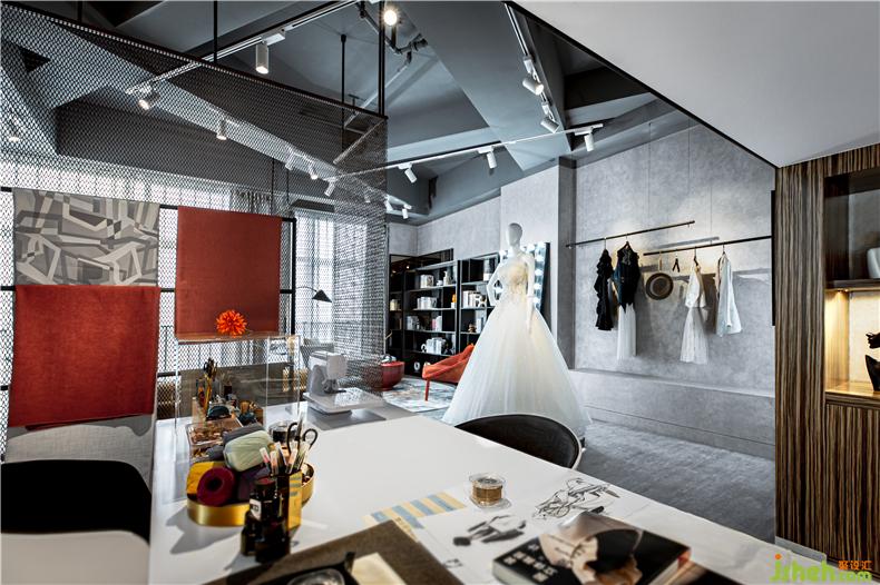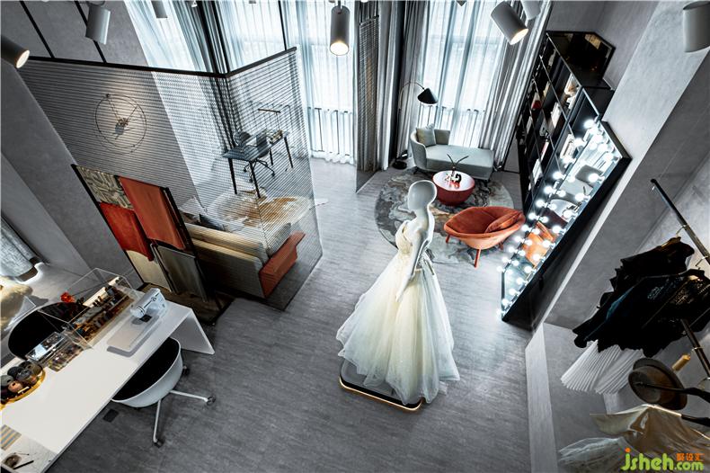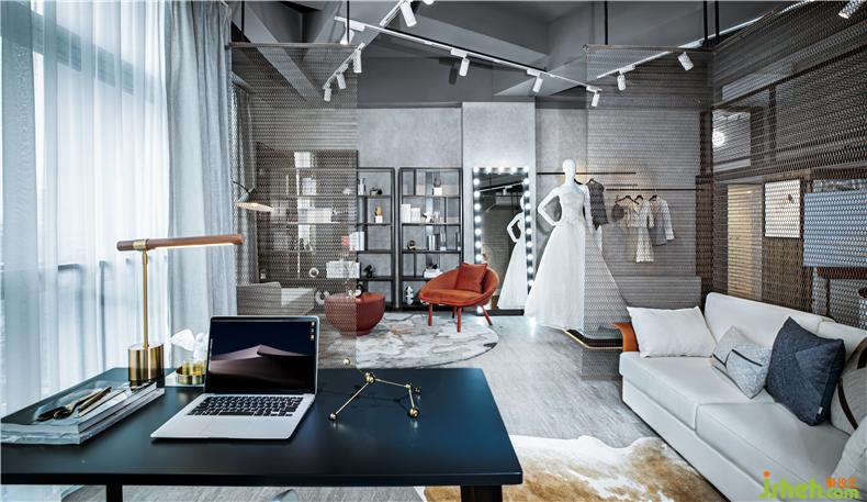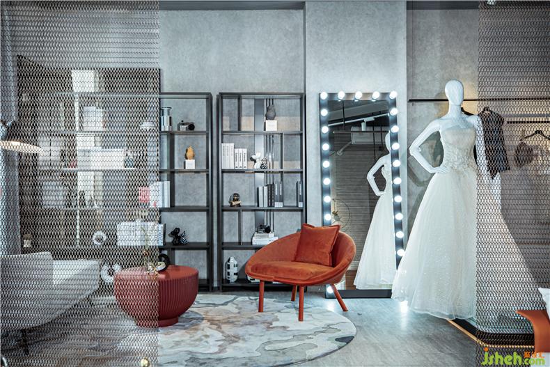 擺拍區(qū)黑色金屬書架配以藝術不銹鋼隔斷,室內(nèi)設計師橘色布藝沙發(fā)和茶幾點綴了整個空間,打破了沉默,時尚感突出;立面穿衣鏡映射出的展示臺婚紗,使不同空間的材質(zhì)得以延續(xù)和連接,活躍氣氛