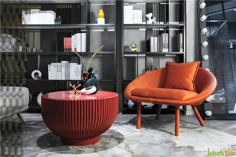 走到內(nèi)側(cè)即平面左側(cè),是這里最大的挑空空間,有轉(zhuǎn)角無(wú)遮擋的大片落地玻璃窗,視野很好,這一處必然留給老板與空間主要展示功能區(qū)。沉穩(wěn)溫和的皮革沙發(fā)和打破常規(guī)的地毯結(jié)合,給空間賦予更多的時(shí)尚和趣味感