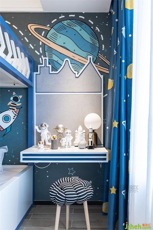 兒童房以熱氣球、海洋、太空主題形式,在孩子幼年時(shí)期身體各方面迅速發(fā)育階段,這個(gè)階段孩子對周圍充滿極大的興趣,比較好動(dòng)。艷麗的色彩能夠激起孩子的活力,使孩子產(chǎn)生興奮,而且強(qiáng)烈的色彩也能夠刺激孩子的視覺神經(jīng),有利于孩子眼睛視力發(fā)育。