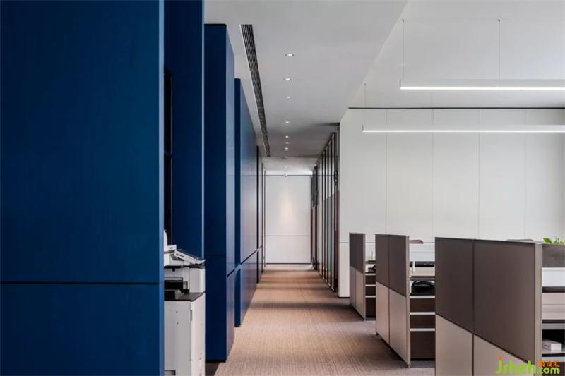 本樂(lè)章為交響曲中的交替奏出、活潑的旋律。公共辦公區(qū)設(shè)計(jì)延續(xù)了冷靜的藍(lán)色色塊,以色彩渲染間接影響員工的工作情緒與場(chǎng)景需求,在這樣的空間中人與空間的狀態(tài)是靈活的,多變的。