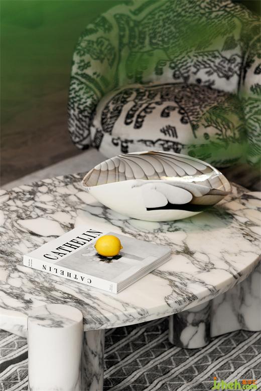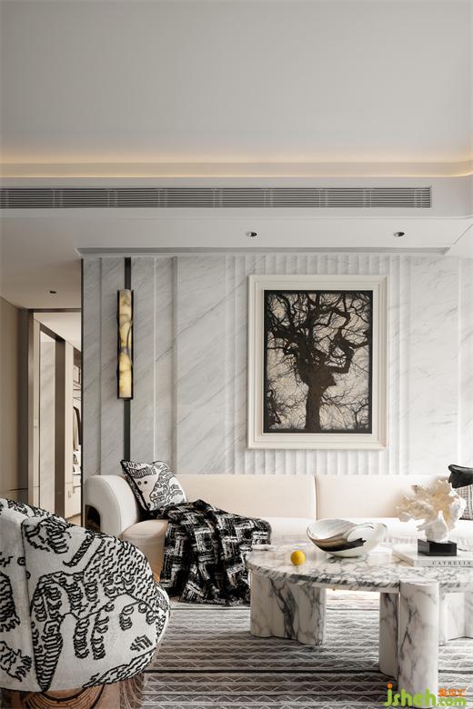 黑白詩篇展開精神世界里的各樣色彩,自然的紋理元素流動其中,茶幾與背景巖板的大理石紋相互交映,和諧而統(tǒng)一。