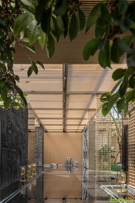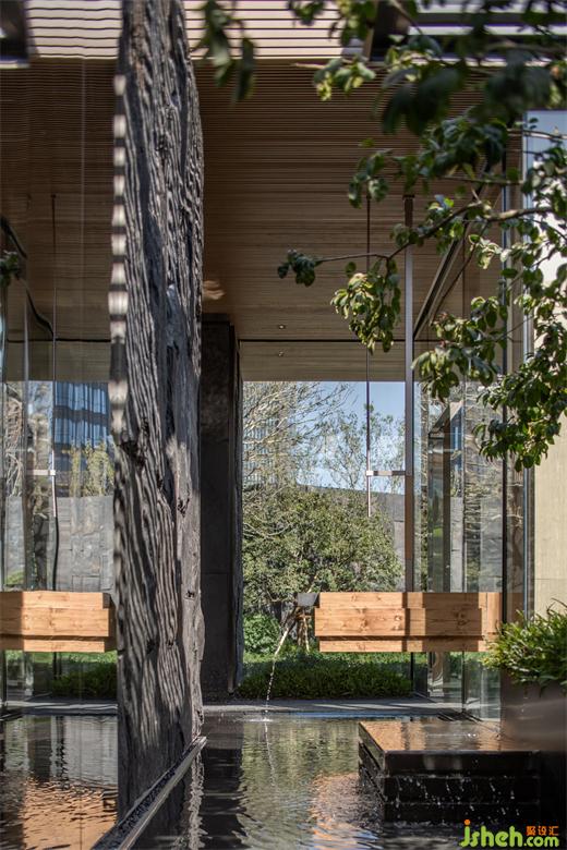 水景以天然花崗巖與原木壘砌而成,小泉瀑布傾瀉而下,濺起清涼的水感,猶如置身于溪谷,帶走城市的紛紛擾擾。