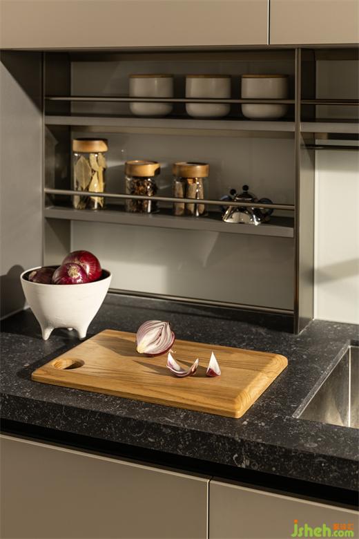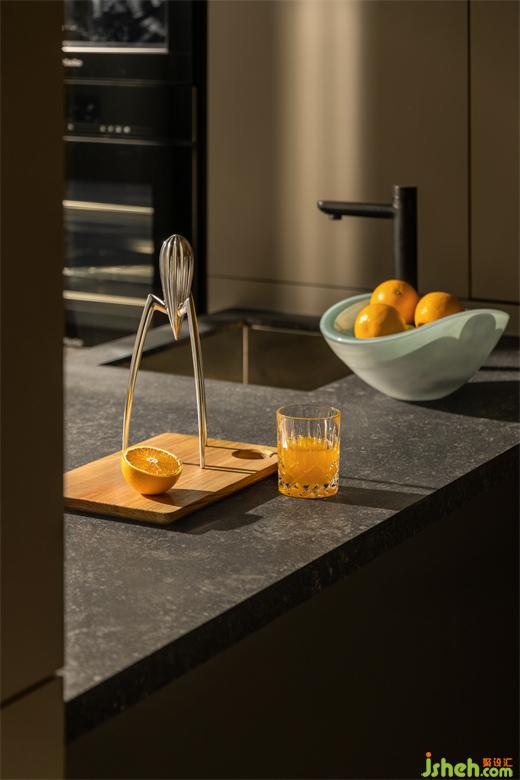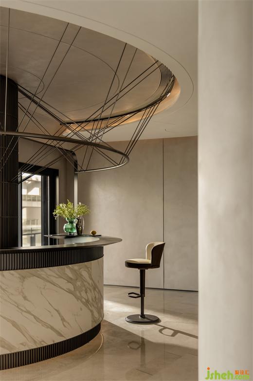 設計師從船艇桅桿得到靈感,化作吧臺的線條,筆直有力的金屬搭配白色大理石紋,簡單的手法達到四兩撥千斤的效果,溫潤奢雅而纖塵不染。