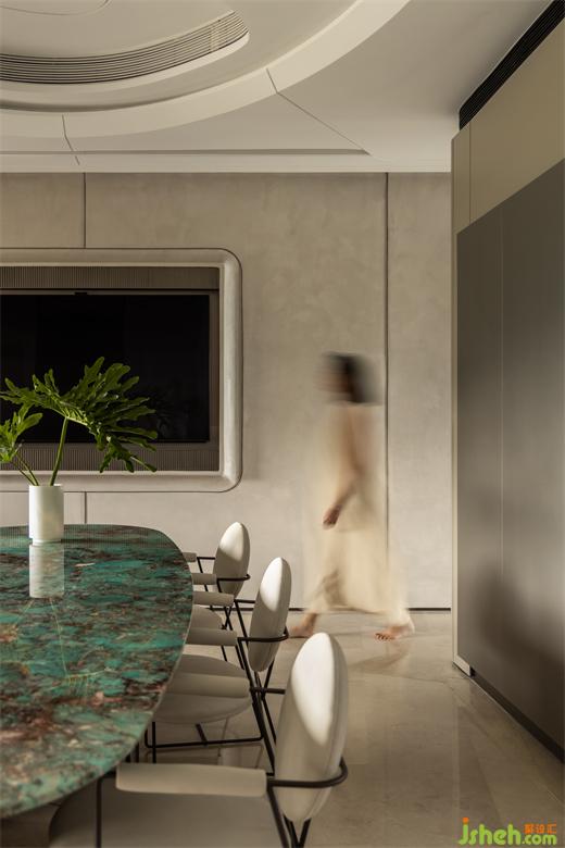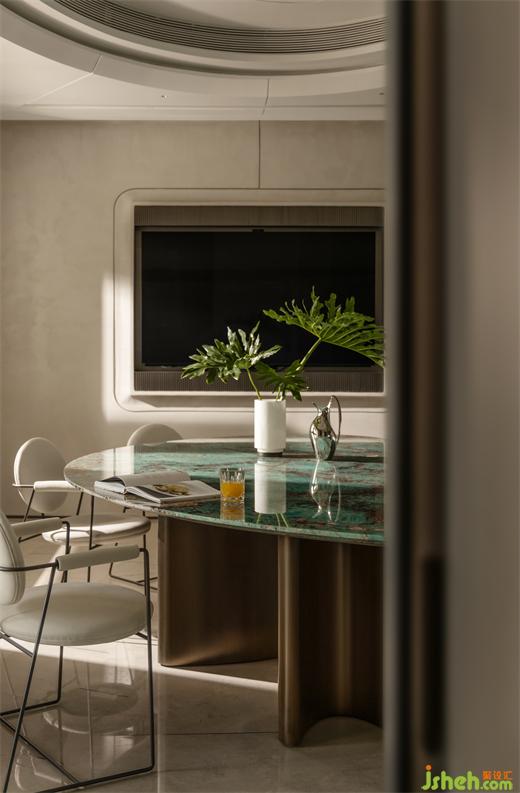 三亞私宅設計將餐廳布局在南面,搭配亞馬遜綠石打造3.2×1.5米長的餐桌,海藍色調(diào)的石材呼應山海的翡翠光輝,讓每一次相聚都是欣喜的際遇。