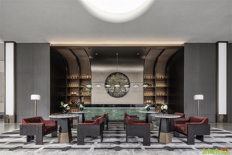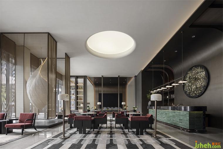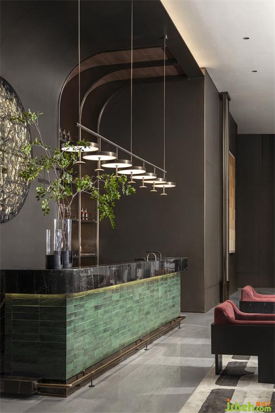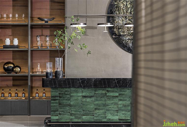 水吧主材提取了當(dāng)?shù)劓闹莞G的工藝及色彩打造的手工磚,金屬網(wǎng)與古銅色層板,售樓處設(shè)計(jì)用材質(zhì)的肌理營造多元、多層次造型,傳統(tǒng)技藝與當(dāng)代審美在此相融相生,散發(fā)出新生的力量。