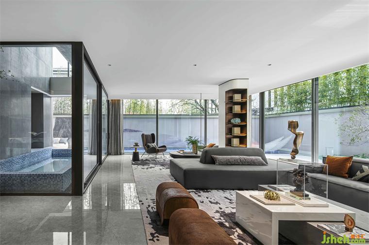別墅樣板房設(shè)計(jì)不需要范式,打破帶來(lái)的趣味往往更深入人心。泳池不再是單一功能性的,而是成為了景觀,延伸至室內(nèi),吊鐘與藍(lán)天倒映在水中,搖曳生姿,生活的趣味不就是在這不經(jīng)意的美之中嗎?