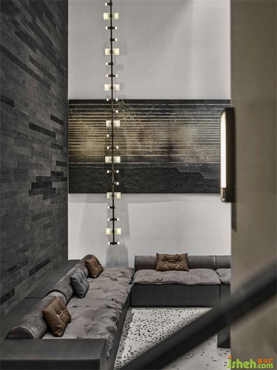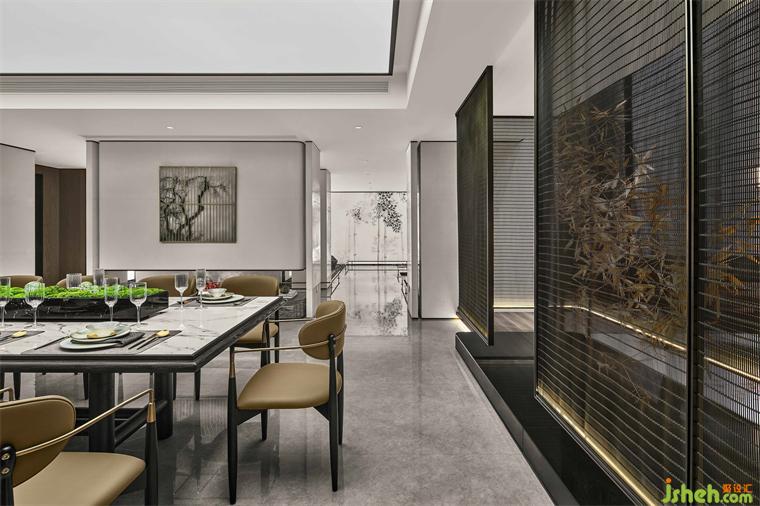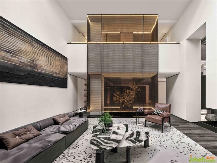 別墅樣板房設計上增強了空間的建筑感,壁畫隱藏于視野中,移步異景,“柳暗花明又一村”的體驗,讓整個空間多了一份律動的變化和頓挫之感。