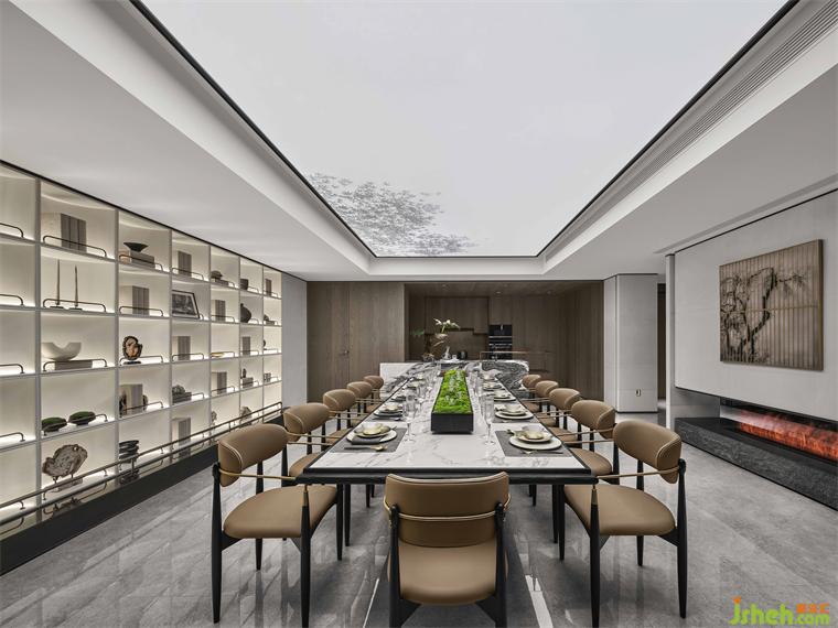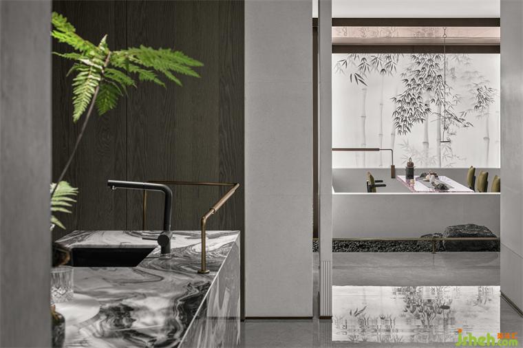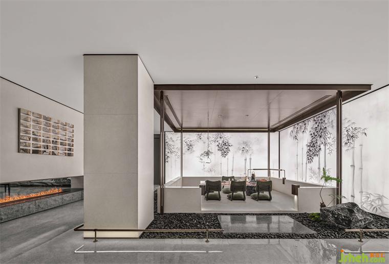古之雅士喜歡在山中設亭,喝一杯清茶,聽一場風。別墅樣板房設計結合日式聞鳥亭和中式園林常見的湖心亭,于室內構筑一方茶亭。竹影松動,清泉石上,淡淡的茶香漸漸彌漫,閉上眼似乎也有了逍遙于山水間的愜意。