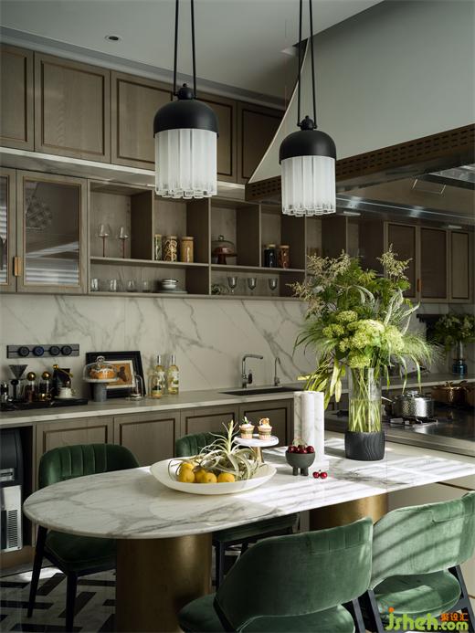 餐廚一體,用了偏西方的設(shè)計(jì)方式,但其實(shí)是以更符合當(dāng)代人的生活習(xí)慣而進(jìn)行設(shè)計(jì)。居住者喜愛在家舉辦宴會(huì),更開放的空間形態(tài),滿足人與之間的溝通,而與戶外相連的設(shè)計(jì),也讓人與自然之間形成了更深的連接。