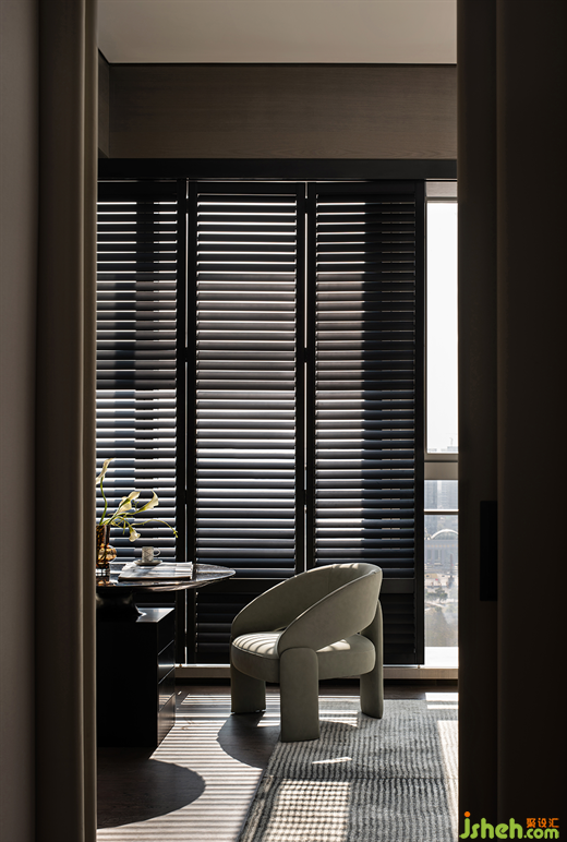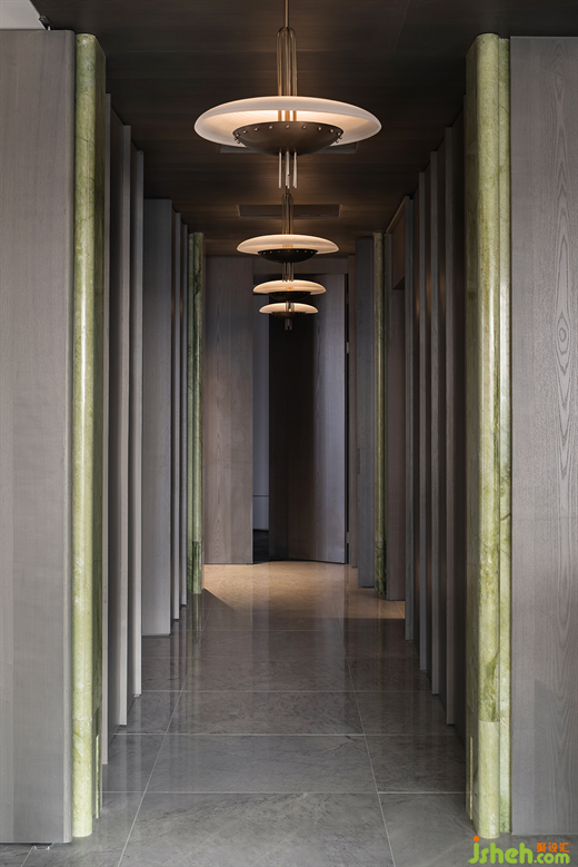 走廊的吊燈,是對黑膠文化的致敬,經(jīng)典的片狀線條和復(fù)古的造型,樣板間設(shè)計仿佛置身于那個時髦摩登的年代。隨即,畫風(fēng)一轉(zhuǎn),此刻的你,似乎又化身成了桃花源記的主人公,沿著走廊,由外而內(nèi)深入。