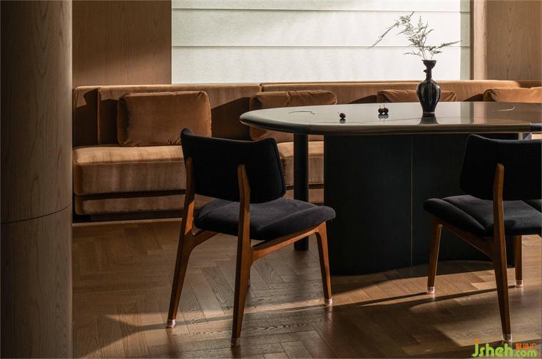 原本雨中安靜的茶室,偶爾雨停陽(yáng)光穿透進(jìn)來(lái),斑駁的光影打在沙發(fā)上和木地板上,自然而松弛。