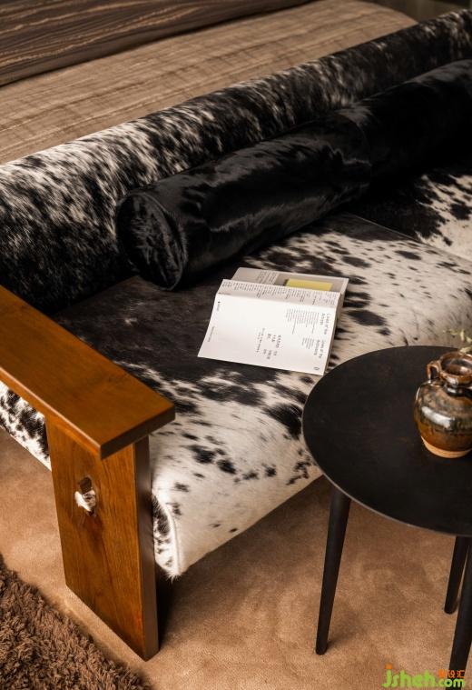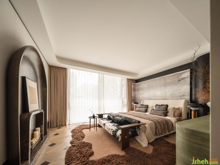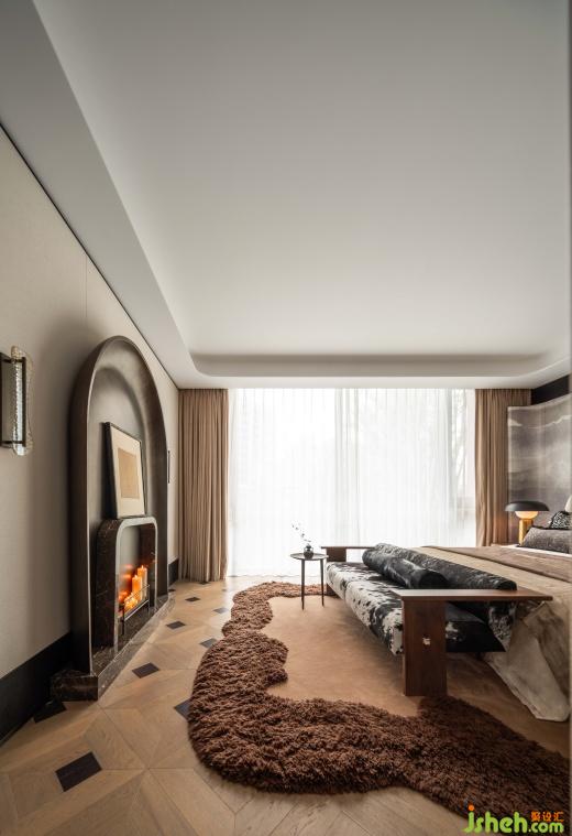 主臥在穩(wěn)重大氣之余兼具靈動自由感。雪花馬毛的床尾沙發(fā),珍珠魚皮與金屬結(jié)合的邊柜,腐蝕銅質(zhì)感的壁爐帶來了奢華的觸感,而壁爐上放置的男主人寫給女主人的信及有機蔓延的地毯形態(tài)則賦予了不少浪漫氣息。