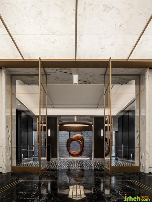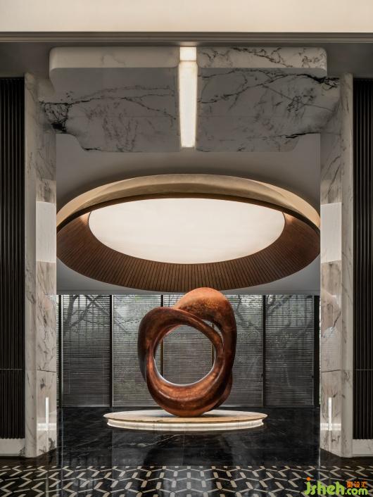 會所設計金色穹頂下的藝術雕塑裝置,巧妙融入蘇州河的元素與文化,環(huán)形符號寓意著時間的輪回、城市的變遷與文化的積淀,在時間的年輪中留下深刻印記。