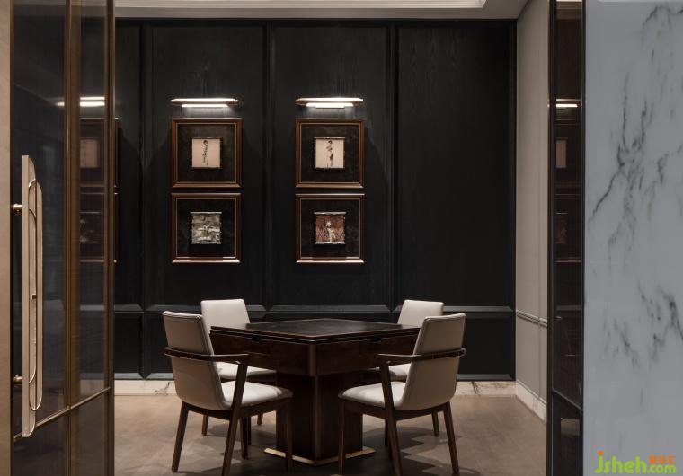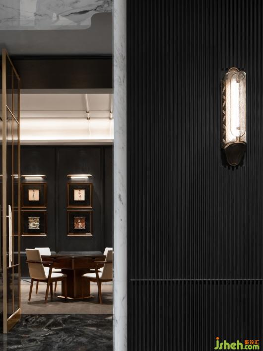 棋牌室用黑色的肌理與深棕色的木紋相互呼應,將旗袍面料和實物裝飾成畫,高貴而典雅,考究中顯露出萬物靜默的內(nèi)核,深而沉的空間充滿著故事感。