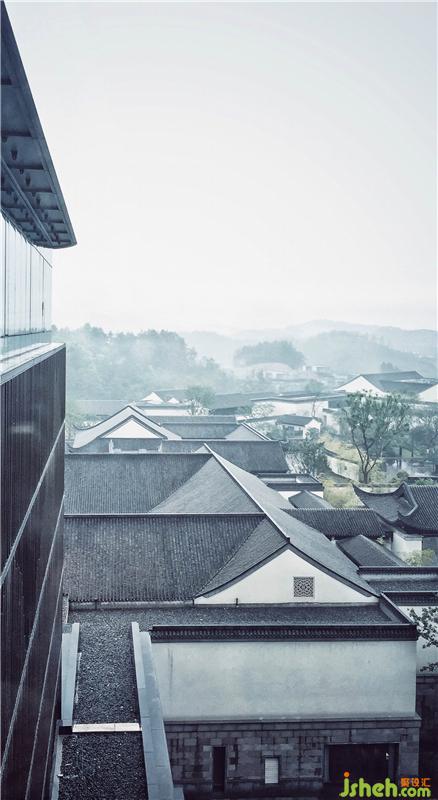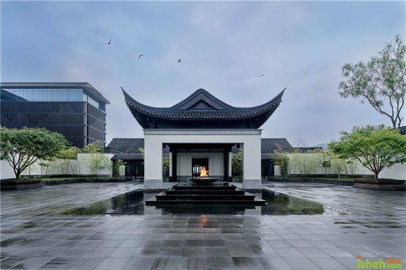 與自然為鄰,酒店的白墻黑瓦置身于青山綠水間,飛揚的檐角若隱若現(xiàn),如同渾然天成的江南水墨畫。