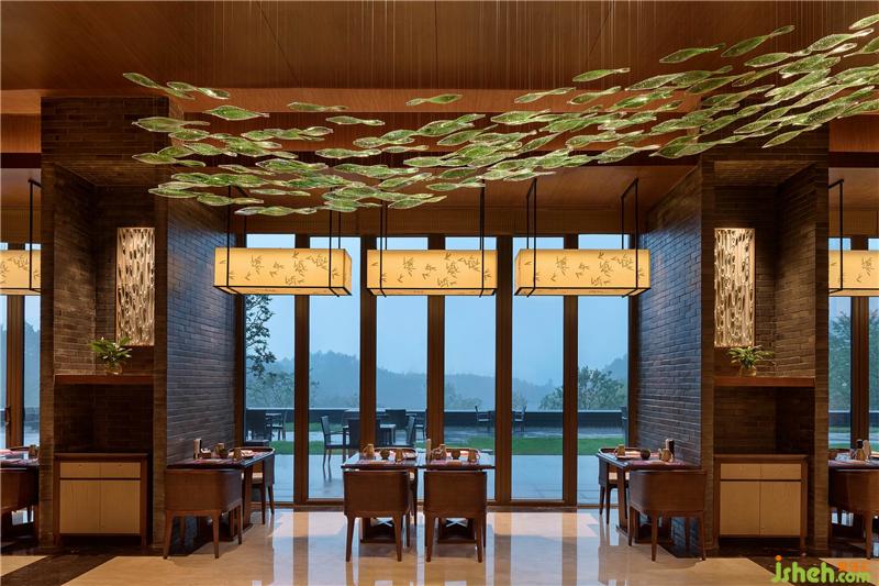 提到安吉,不得不讓人想到茶中極品,全國獨有的白茶。一片片玻璃制成的白茶葉如同被水沖泡,以旋渦狀漂浮在全日餐廳上空,詮釋著清凈淡泊的文化內涵。而一旁方形燈的竹葉暗紋,銜接窗外綠意,使窗內外空間的自然意境無縫對接。白茶清歡無別事,竹下閑坐,是一種超然物外的心境。竹編的座椅將濃郁的田園休閑氣息帶入空間,放下心頭雜事,讓美味在舌尖跳舞,未嘗不是一種圓滿。酒店設計