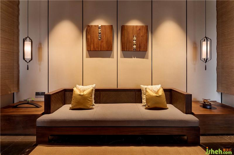 竹編家具的質樸與淡雅清新,則體現(xiàn)出濃濃的地方特色,搭配淺灰色亞麻布料,讓人透過麻質粗糙的纖維肌理觸感來感受自然,契合休閑度假風格。再配以暗紅、金、黑色的抱枕,以跳色手法,打破空間的沉悶感。酒店設計