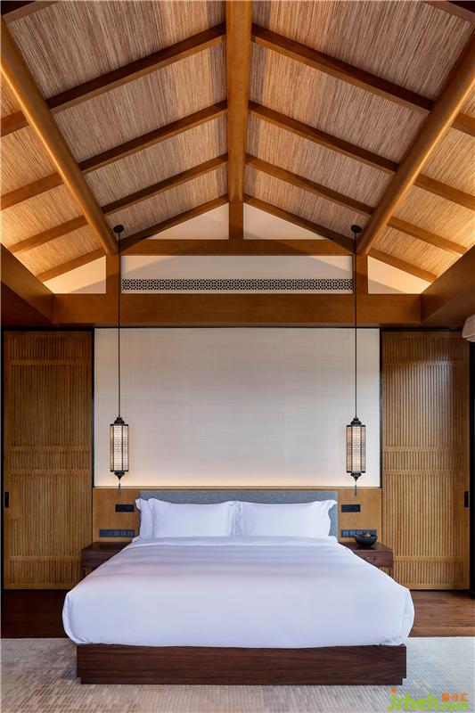 別墅客房風(fēng)格簡潔質(zhì)樸,形如竹片的地毯,紋路細(xì)膩,深黃、淺黃、淺灰的顏色暈染,增加空間的寫意感;床頭的金屬布罩吊燈與客廳的燈具形成系列,是結(jié)合中國古典窗格圖形與紙糊燈籠外觀演變而來,既經(jīng)久耐用,又使整體空間的中式氛圍更加濃郁。