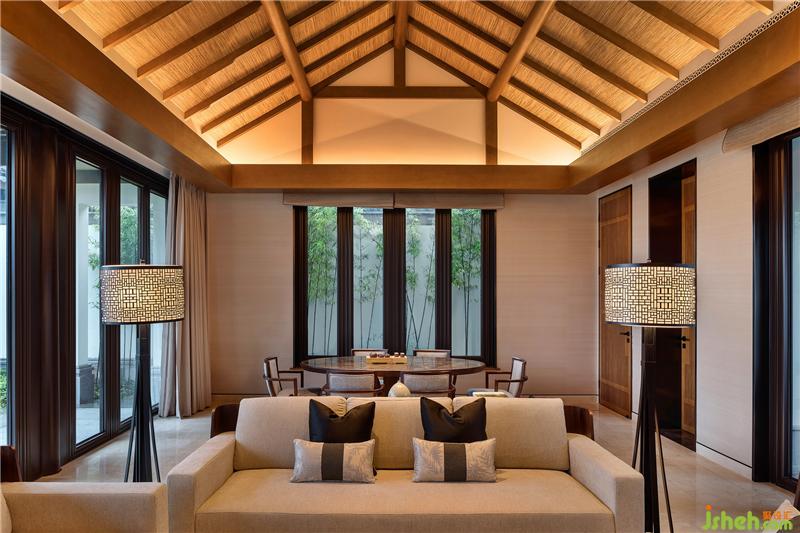 酒店設(shè)計(jì)客廳沙發(fā)區(qū)的深色木質(zhì)家具延續(xù)空間的硬裝色調(diào),圓潤的曲線與溫潤的觸感盡顯敦厚沉穩(wěn),搭配淺色系的布料,古樸而典雅。黑色絲綢抱枕采用中國畫的描邊手法,并以金色勾邊,提亮空間,體現(xiàn)出悅榕莊低調(diào)的華貴氣質(zhì),小腰枕上的竹葉暗紋呼應(yīng)窗外竹景,營造詩意棲居氛圍。