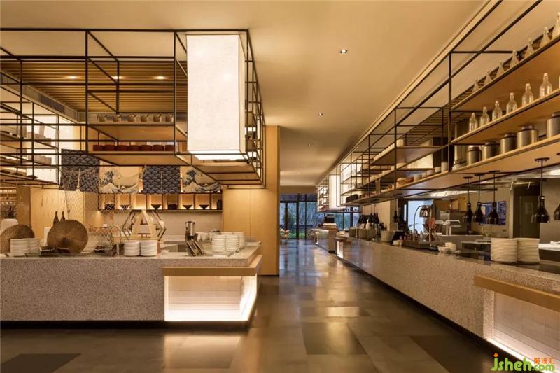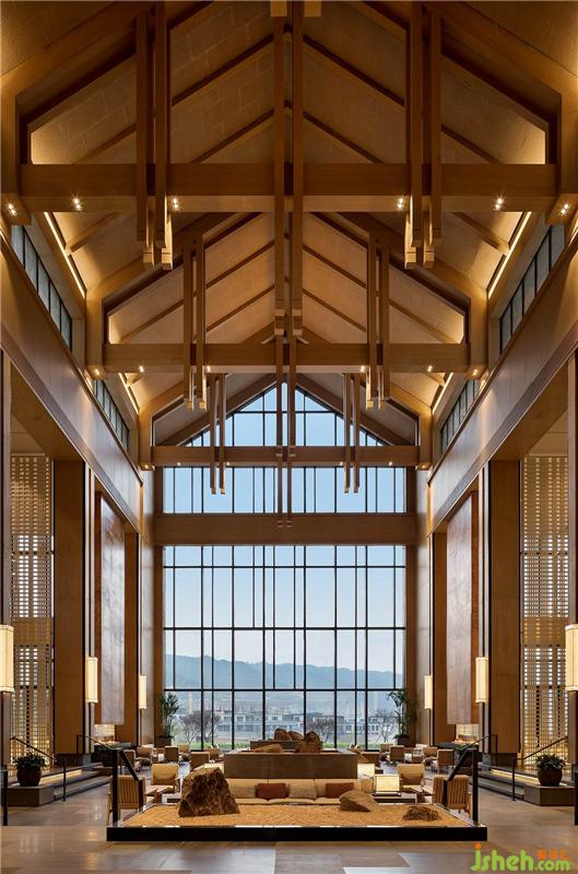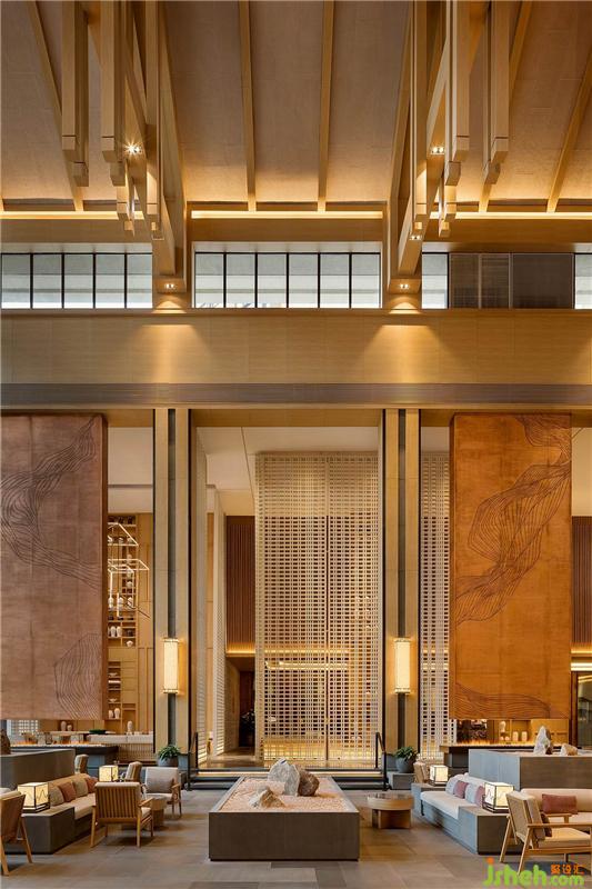 酒店大堂因土建較高,天花又為斜面,最高點接近13米,為解決超高的空間尺度感,YANG從中國傳統(tǒng)建筑中獲取靈感,用具有自然肌理的木紋鋁板在天花構(gòu)建區(qū)別于傳統(tǒng)形式的木梁結(jié)構(gòu),增強空間建筑感,又盡顯休閑度假風(fēng)情。酒店設(shè)計