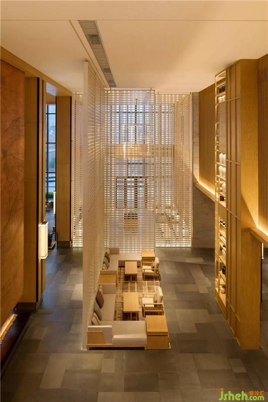 “楊柳又如絲,驛橋春雨時”,春雨滋潤萬物,是一切生命的開始。遠看似煙、如霧,如仙境般柔和與淡白。大堂作為酒店的序幕,YANG以春雨為空間設(shè)計靈感,將天花連接地面的白色柵格屏風(fēng)錯落分置,似有形又無形,讓空間通而不透,形成若隱若現(xiàn)的悠遠意境。令每一位步入大堂的賓客,仿若聽見淅瀝瀝的春雨,唱著萬物復(fù)蘇的生命之歌,帶來清新自然的空間體驗感。酒店設(shè)計