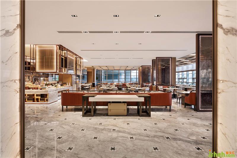 行政酒廊充分結(jié)合建筑本身的飄帶傾斜角,以原木跌級造型設(shè)計天花,營造深淺有序的變化美。