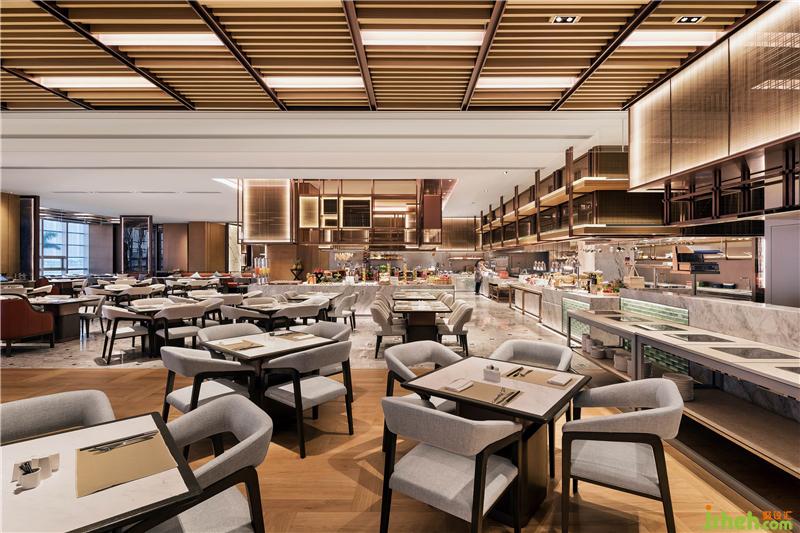“悅”全日餐廳,設(shè)計靈感來源于海邊漁排。深夜?jié)O排上閃爍的漁家燈火,被設(shè)計師以金屬和玻璃發(fā)光條組合編織于餐廳入口處,用漁家簡單、純粹的生活氣息沉淀都市人內(nèi)心的焦慮與浮躁。餐廳內(nèi)部的裝飾吊柜與屏風(fēng)設(shè)計,豐富空間層次,同時營造朦朧浪漫的就餐氛圍。酒店設(shè)計