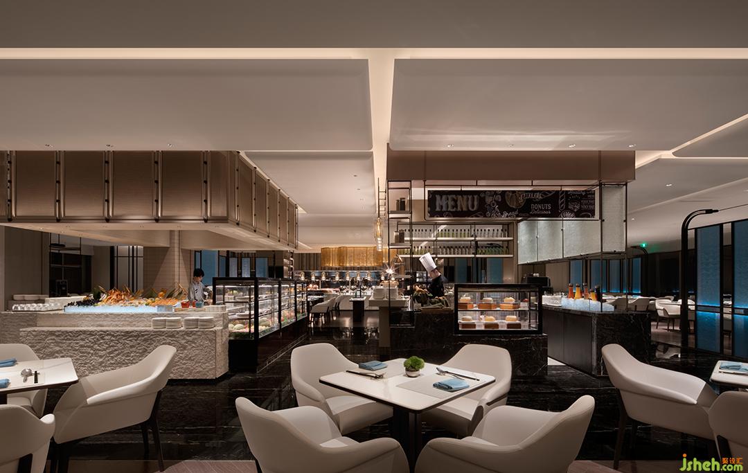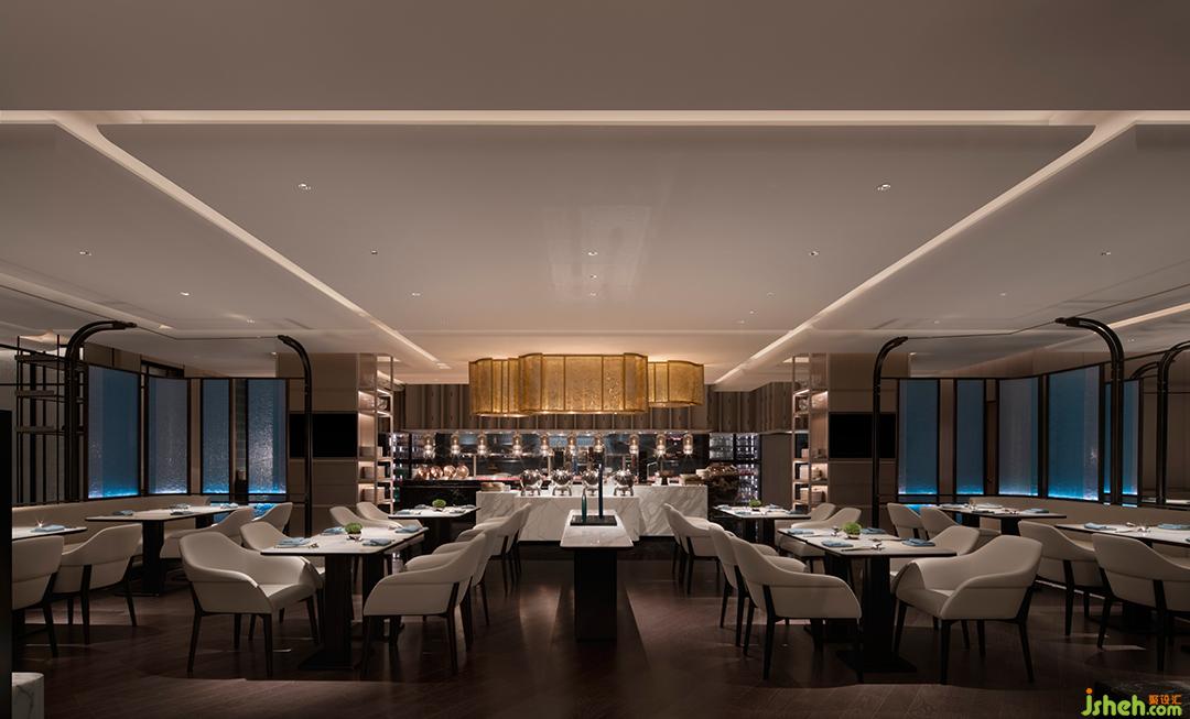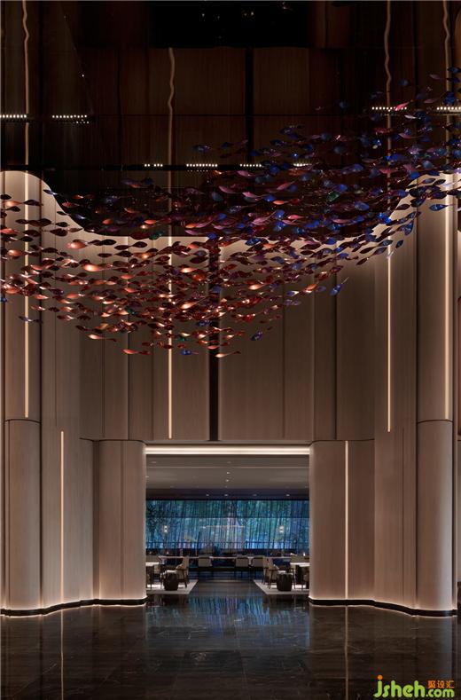 特別設(shè)置嵌入式壁爐,火焰躍動(dòng)長夜,靜謐無聲燃燒,宜圍爐品茗,或文學(xué)沙龍?;⌒文緣ρ由熘岭娞輳d,如游園小徑曲折幽邃,赤色玉璧上水紋旋轉(zhuǎn)相生,以文人之雅,禮迎中外。