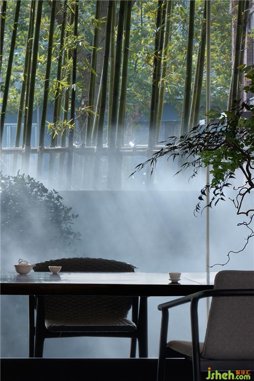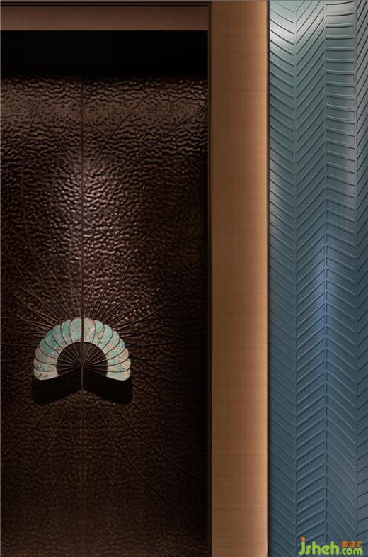 中餐彩豐樓,剪裁漣漪的起伏為墻,為接待。鳳羽的肌理流溢墻面隔斷,合則為扇鑲嵌門扉,湖藍(lán)、玉青、啞金暗相輝映,與弧形天花、細(xì)密線刻墻,共同鋪陳精致腔調(diào)。