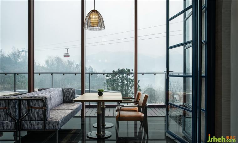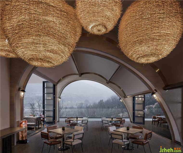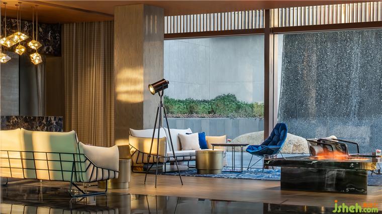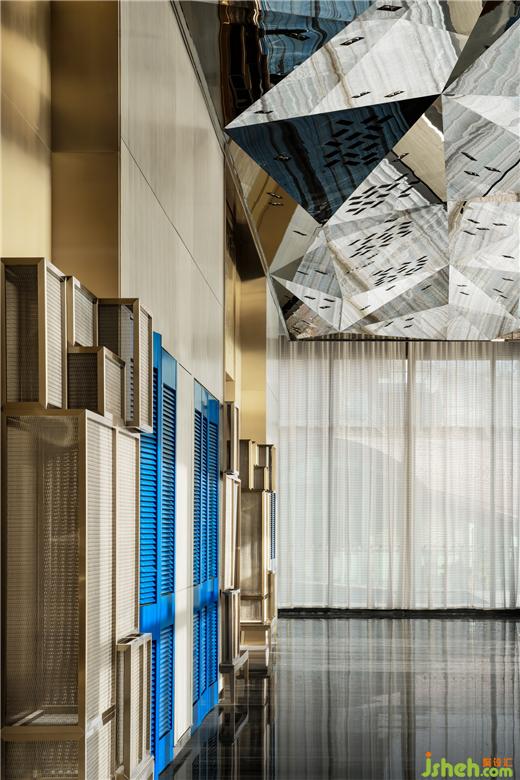 東方既白,光線穿透全幕幻彩玻璃大門,噴濺寶石虹彩。躍金沉璧,大堂流溢輕盈的夢。懸浮的鏡面金屬構(gòu)成巨大茶晶,似琥珀凝駐歲月。南京園博園英迪格酒店設(shè)計八根亞克力圍裹原木廳柱,身披銀色風(fēng)蝕銹衣,書寫遠古叢林的神秘。