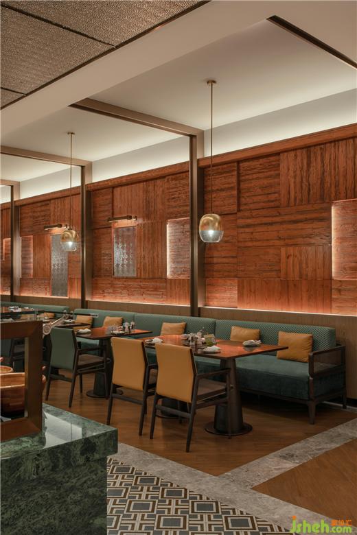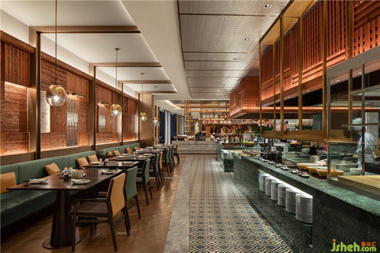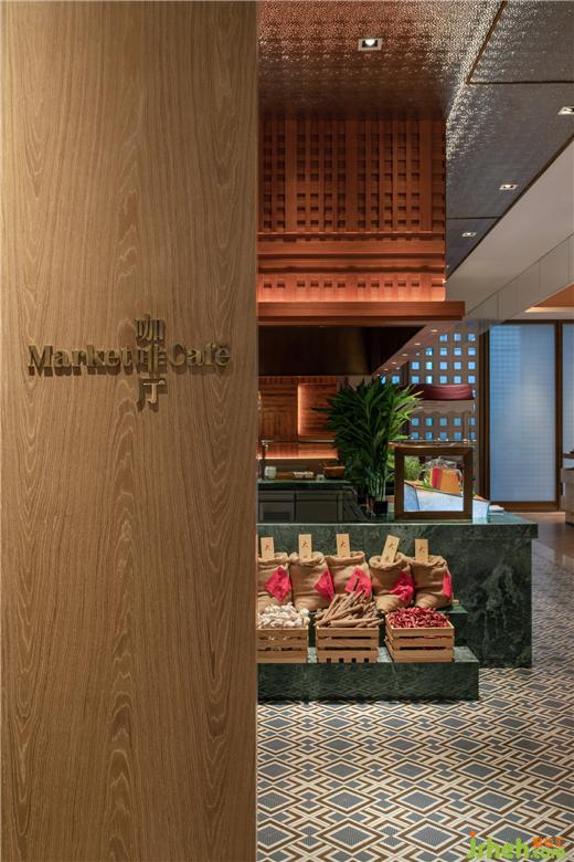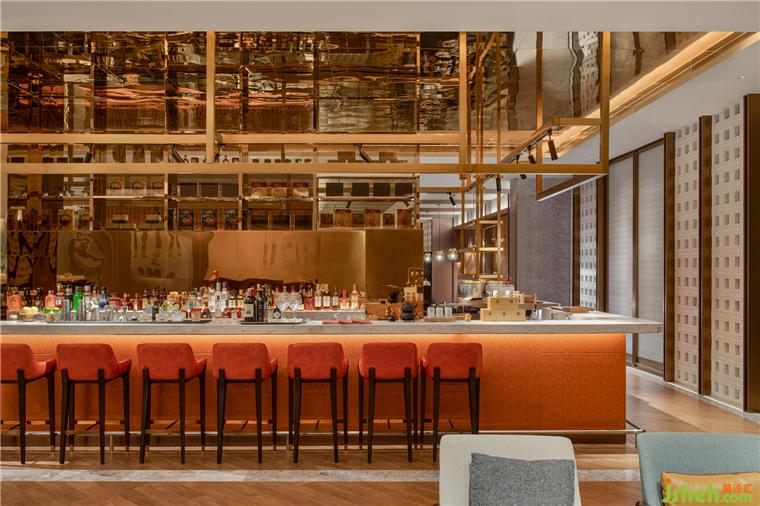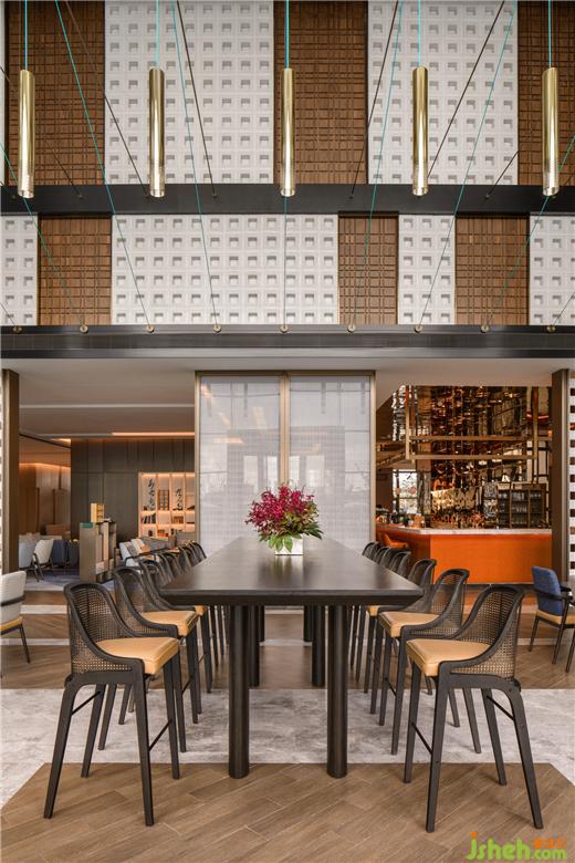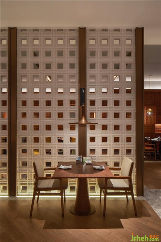 開闊的休息區(qū)上,長線銅柱燈陣列懸空,如舊日紡線密織機紓。古老織布機,被提煉出干凈利落的直線語言,按比例分割裝飾。間或大片胡桃木的深棕、鏤空肌理的荼白,緩解強烈秩序線條帶來的緊張,使空間同時兼具優(yōu)雅及舒適。