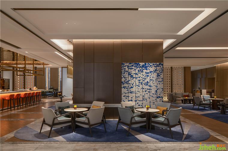 借松江四大布種之一的藥斑紋布為靈感,取其晾掛飄逸之勢,上海松江凱悅酒店設計讓人一進入酒店大堂,就瞬時相逢昔日織造盛景。15米挑高空間,四面菱格陶磚拼貼的藝術裝置如巨幅簾布從天花懸墜而下,奔涌著月白、水綠、鈷藍等色彩……