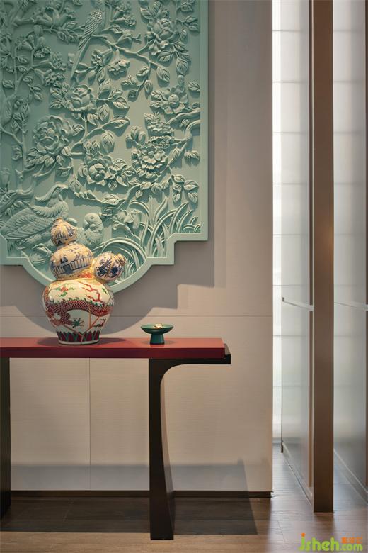 墻面掛飾采用中國四大木雕之潮汕木雕工藝打造,藍綠色的整體運用讓傳統(tǒng)的藝術(shù)品富有當代性,從細節(jié)處流露自然氣息與生活意趣。