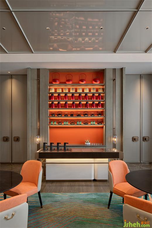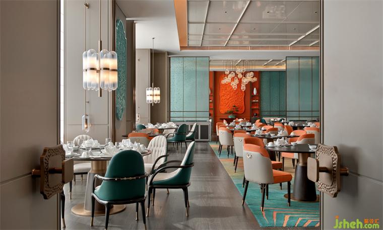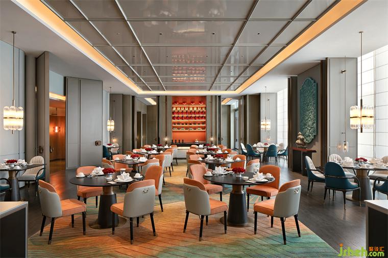 希爾頓酒店設(shè)計中餐廳入口接待出的背景墻一幅由嶺南鑊耳墻特色建筑抽象而成的藝術(shù)畫。取名「青雅」的中餐廳,意在營造「琴棋書畫,鳥語花香」中式優(yōu)雅用餐環(huán)境。廣府傳統(tǒng)建筑中的「青綠」與「橘紅」色調(diào),使中餐廳于古雅中包含熱情。