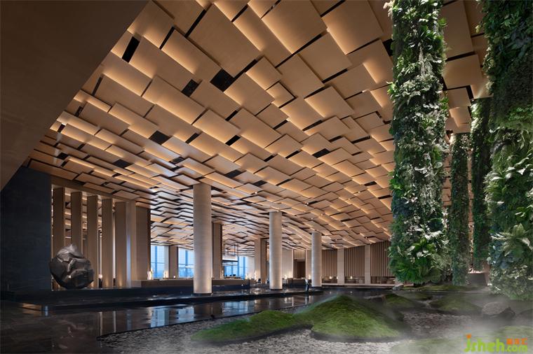 自金陵向東而行,都市的肌理漸漸減弱。大地拔起滿山蒼翠,佛頂塔、佛頂宮默然矗立。抵達(dá)酒店落客處,一葉菩提相迎,清波如鏡,洗去塵心。步入酒店門廳,永生花枝葉婆娑,與朦朧燈光、漣漪地面,南京酒店設(shè)計(jì)共同營造曲徑通幽的體驗(yàn)。