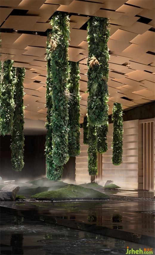 面對創(chuàng)新性的X建筑結(jié)構(gòu),3220平極致闊綽大堂,層高約10米,YANG保留空間的高遠(yuǎn)空曠氣質(zhì),植入立體景觀,營造大而不空、層次豐富、步移景異的感官之旅,構(gòu)建屋檐下的森林禪庭。