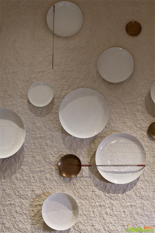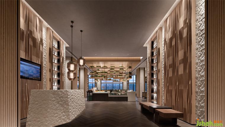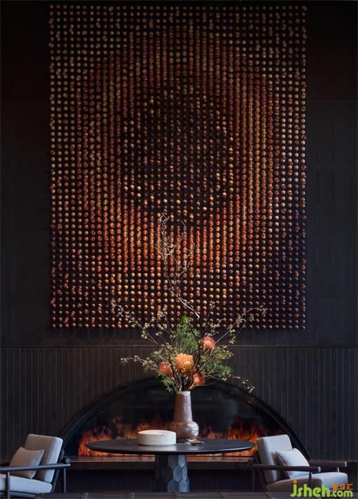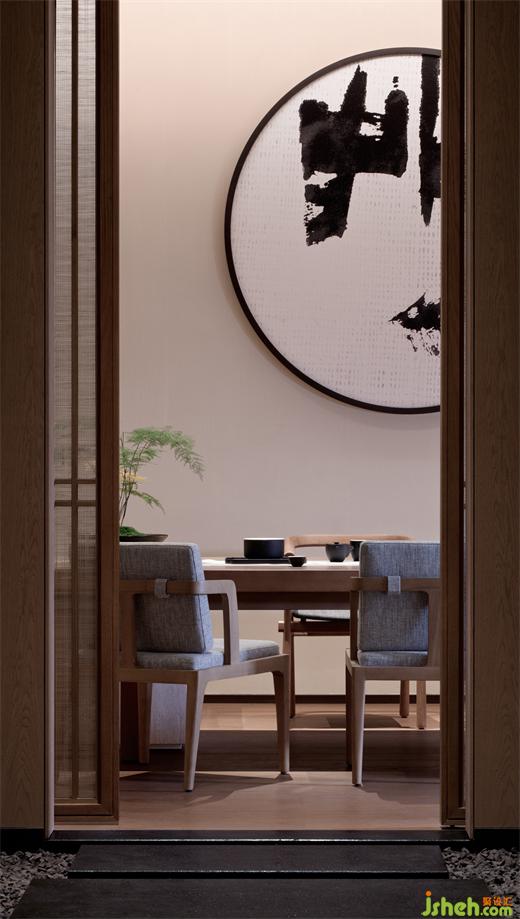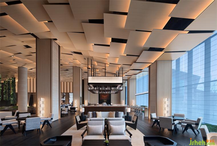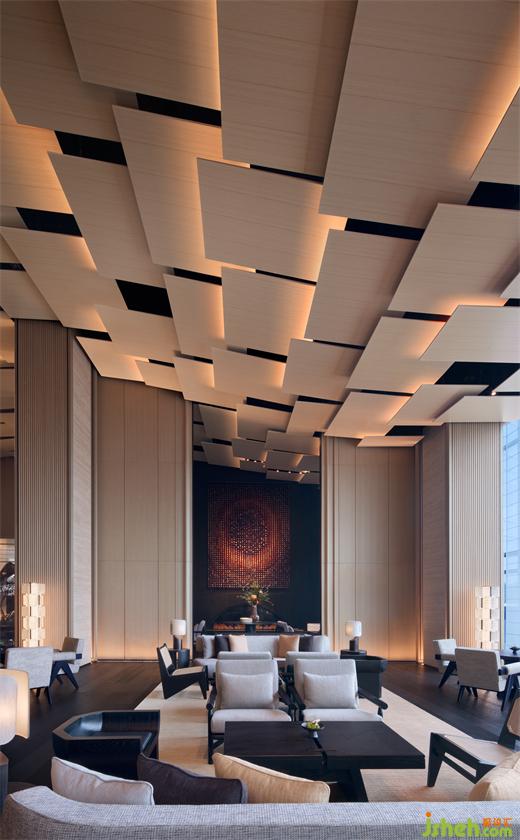 天花如袈裟懸浮,地面青苔隆起為山,數(shù)叢植物垂落成林。喧囂漸寂,建筑成了精神的容器,空與滿皆在光影中。將石材打磨出一圈圈漣漪,清波漫地,加強(qiáng)空間整體意韻時(shí),并滿足荷載限制。大堂吧精心布局沙發(fā)、茶幾,打造自在休閑的社交區(qū)域,聚合人氣,形成功能上的“實(shí)”,與虛靜大堂互為映襯。