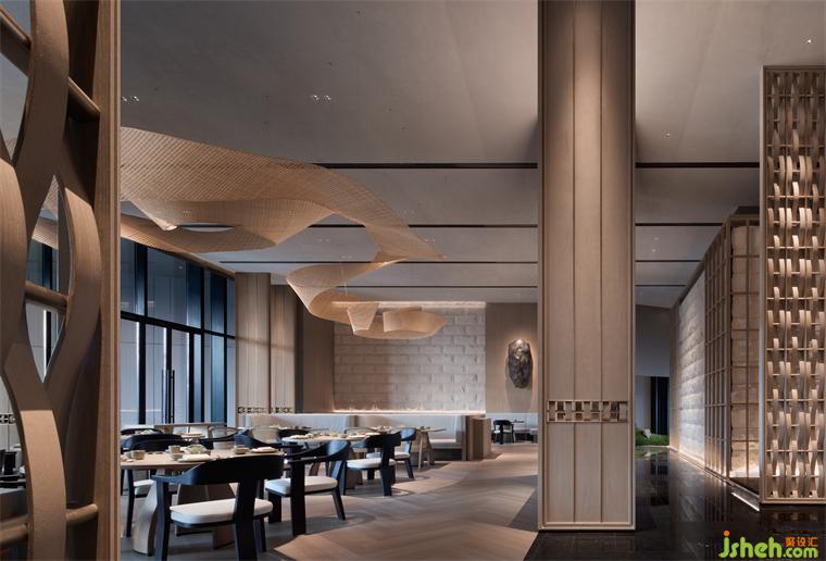 全日餐廳同樣尺度闊綽,超1000平極致空間,YANG去繁就簡(jiǎn),南京酒店設(shè)計(jì)以最少的元素呈現(xiàn)更為開闊通透的意境。質(zhì)樸肌理的涂料天花、原木線性格柵、粗野的巖石肌理墻面與淺色家具巧妙搭配,約33米玻璃幕墻,邀無(wú)邊山色,入宴四時(shí)春秋。