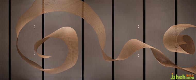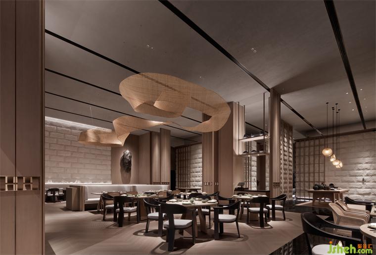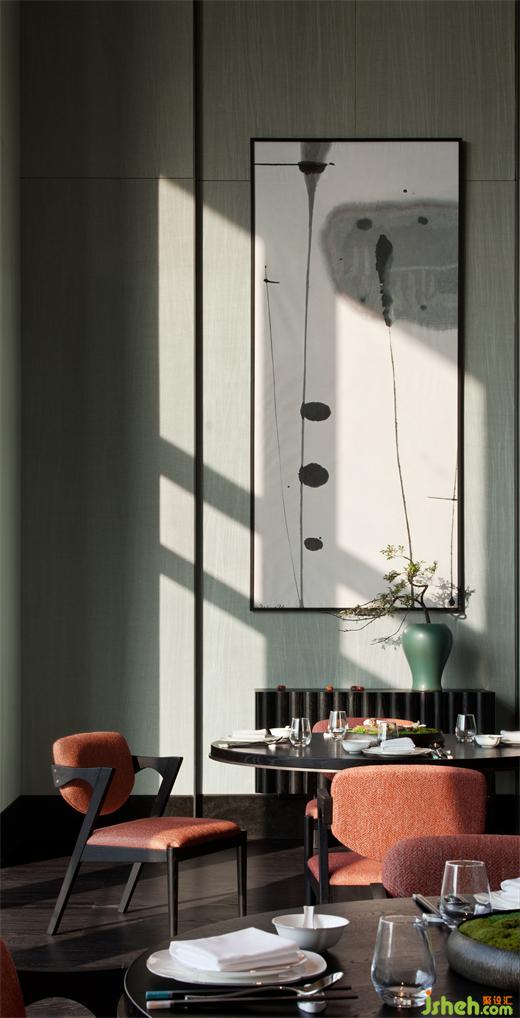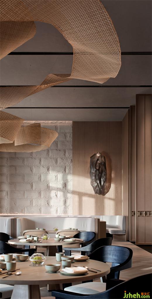 特別引入的素食餐廳,整體設(shè)色清雅,用材樸拙。懸浮的藤編藝術(shù)品、淺灰色仿原石、木紋鋁板編織格柵,一切素樸自然。別具一格的包房設(shè)計(jì),似一個(gè)個(gè)獨(dú)立盒子,散落于翠意盈盈的景觀帶,將餐廳與過道間的2.7米層高落差,轉(zhuǎn)換為錯(cuò)落有致的暗藏驚喜。