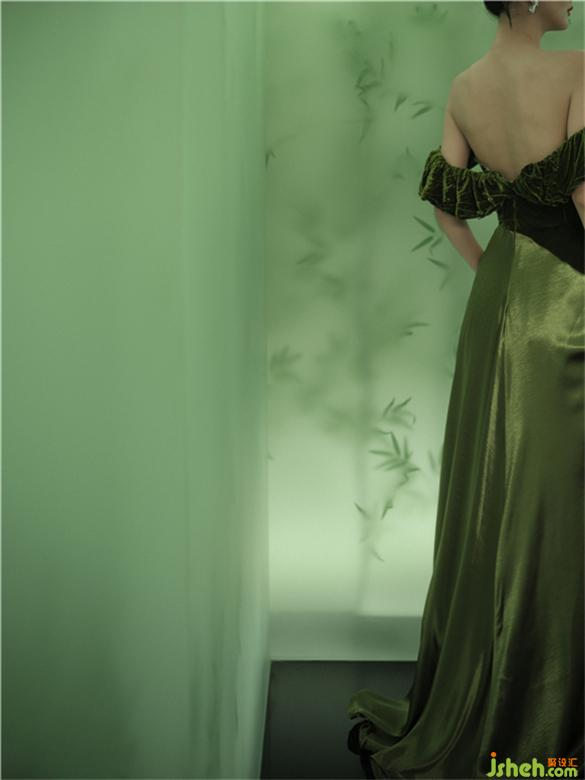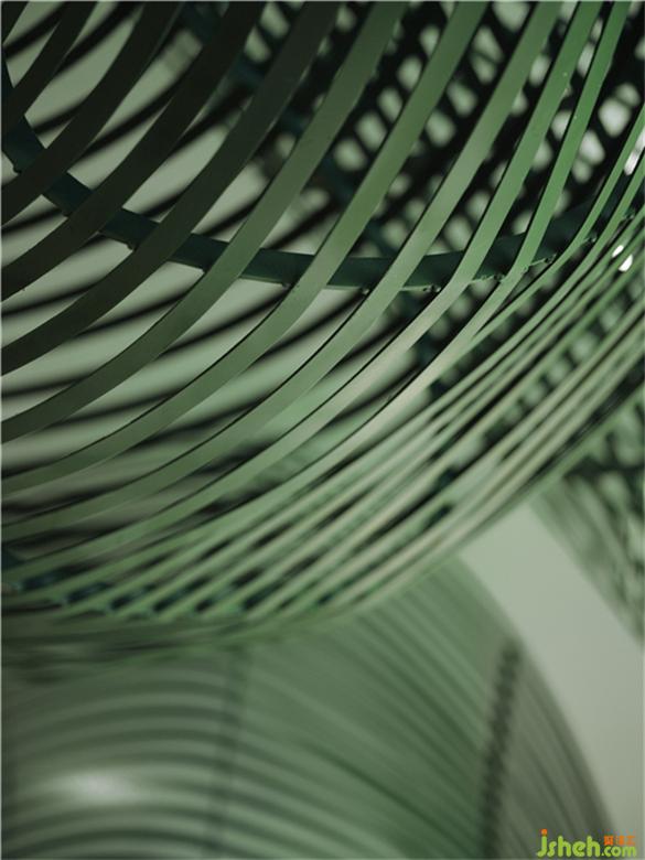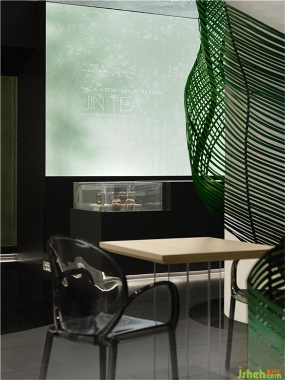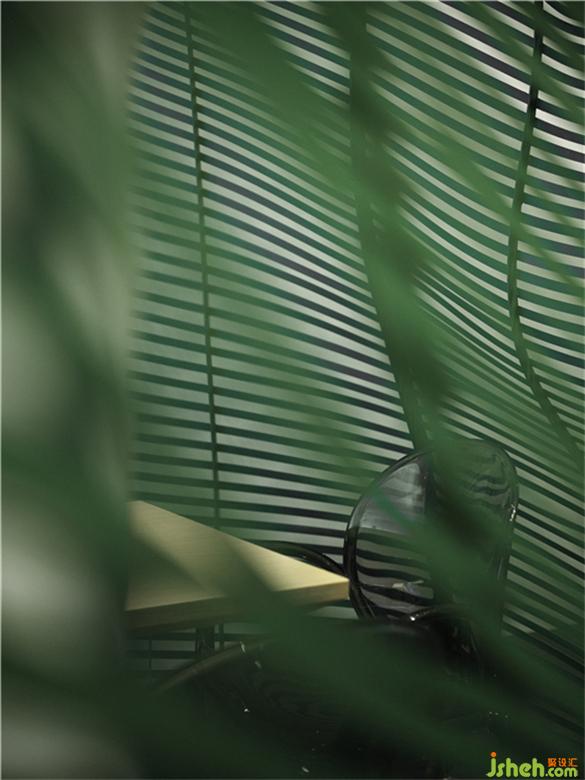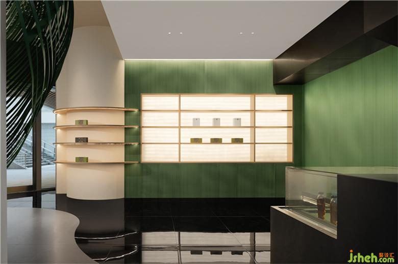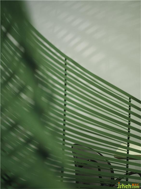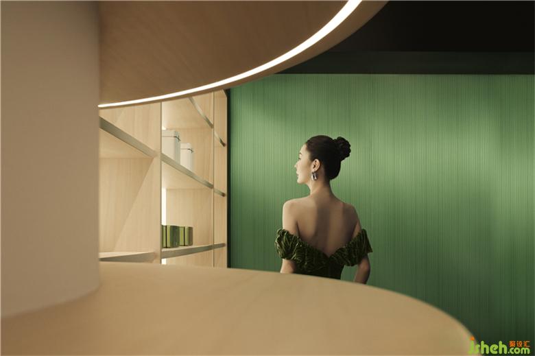 簡(jiǎn)單的帶狀仿葉輪廓營(yíng)造出靜謐的氛圍,柔和蜿蜒的曲線給觀者無(wú)限遐想,與空間內(nèi)大量運(yùn)用的漸變綠色燈光一起營(yíng)造出虛實(shí)之間極簡(jiǎn)的美感。