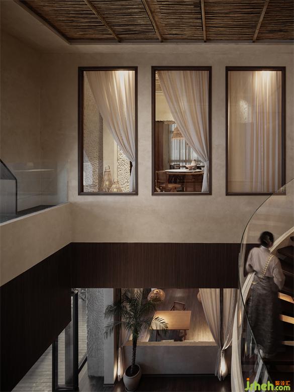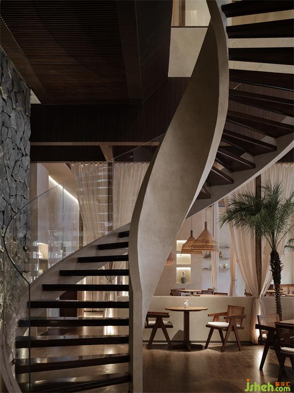 Materials are a deep desire for memory, a sense of identity with culture, scene, and life structure that arises from the tearing of post-modern culture. The rough stone walls are intertwined with the elegantly shaped spiral staircase, creating a clever contrast of thickness and fineness in the space.