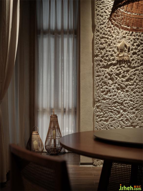 包間內一邊是肌理豐富的拼接石墻,一邊是顆粒感十足的石板,在均勻的洗墻燈照射下,呈現(xiàn)出獨特的光影紋理。