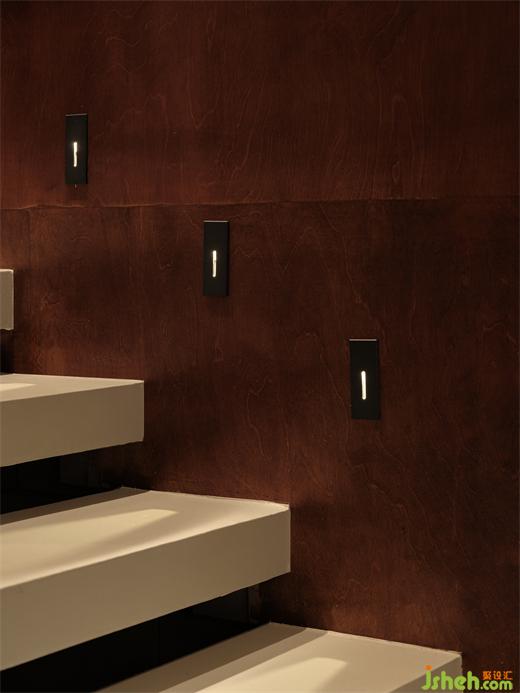 石質(zhì)臺(tái)階結(jié)合玻璃磚墻,劃分出較為私密的辦公空間。該空間也對(duì)到訪的客人開放。極簡(jiǎn)一字型馬扎燈帶來(lái)均勻的光線,冷靜但又溫暖。橫平豎直的管線和書柜、玻璃磚形成了視覺上的呼應(yīng)。