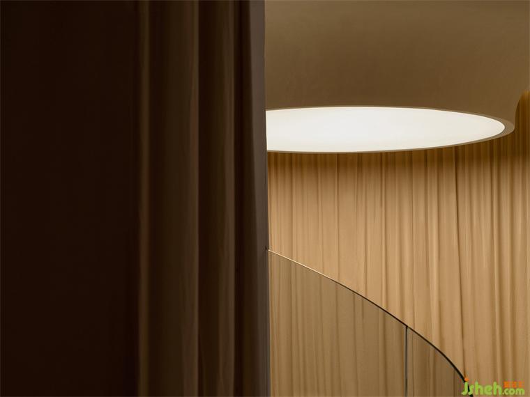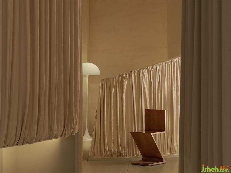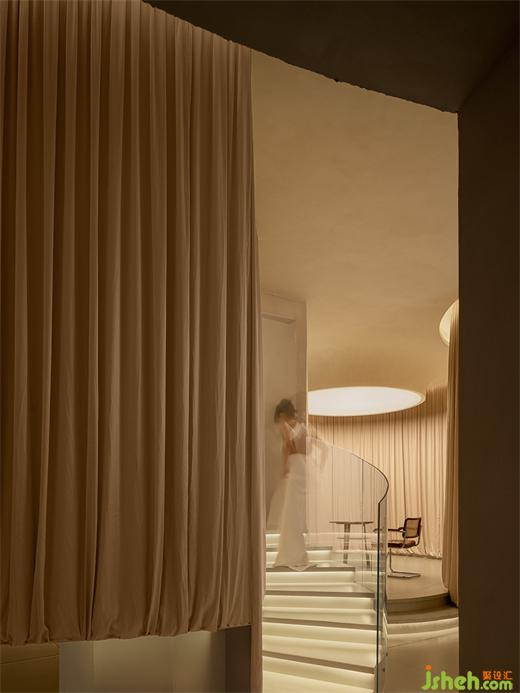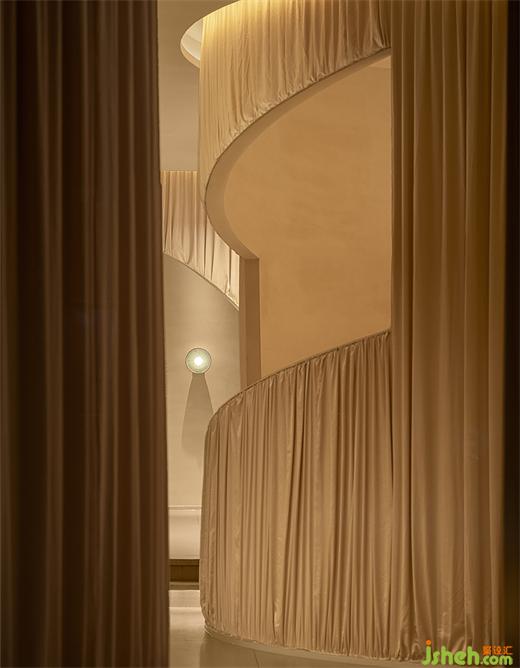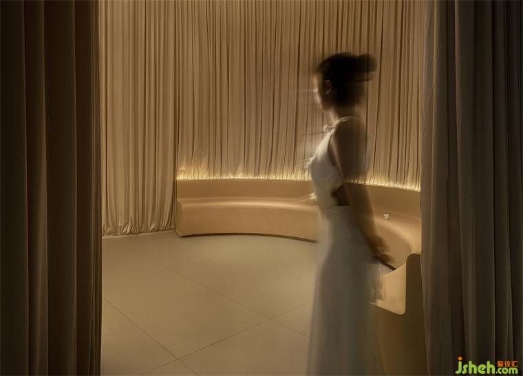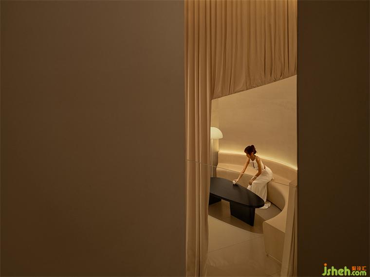 The whole space was softly enveloped by curtains, the main tone of the design, making the whole space more comfortable. “Fabric”, serving as the medium of communication, gets in touch with the intimate territory of the soul by its soft texture and form. We desperately need a quite corner for soul projection and self-fulfillment when we are facing ubiquitous emotions. Here, visitors can totally free them from the noisy world, experiencing love and serenity in the gentle and tranquil space. That’s the purpose of the designer.