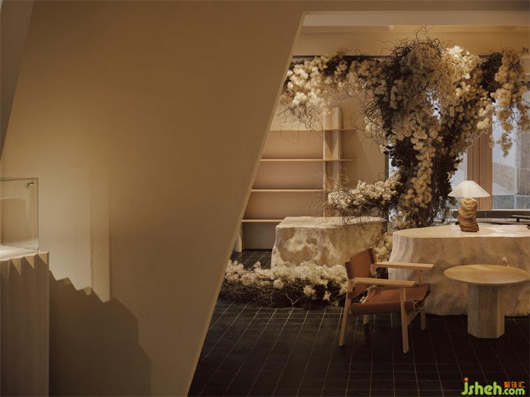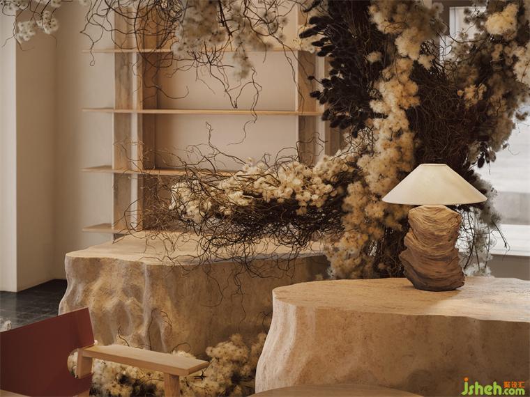 由大型的藝術裝置導入內部空間,讓參觀者在初入空間時就能感受整體的氛圍,輕松而愜意,如沐春風,猶聞花香。裝置靈感來自于曠野的大自然,盤根錯節(jié)的植物根系。這些天然的元素被柔軟地包裹著,蔓延著。轉身而過,木質吧臺溫柔的棲息在你的周身,這里不止售出石頭的藝術也販賣美味的典藏。