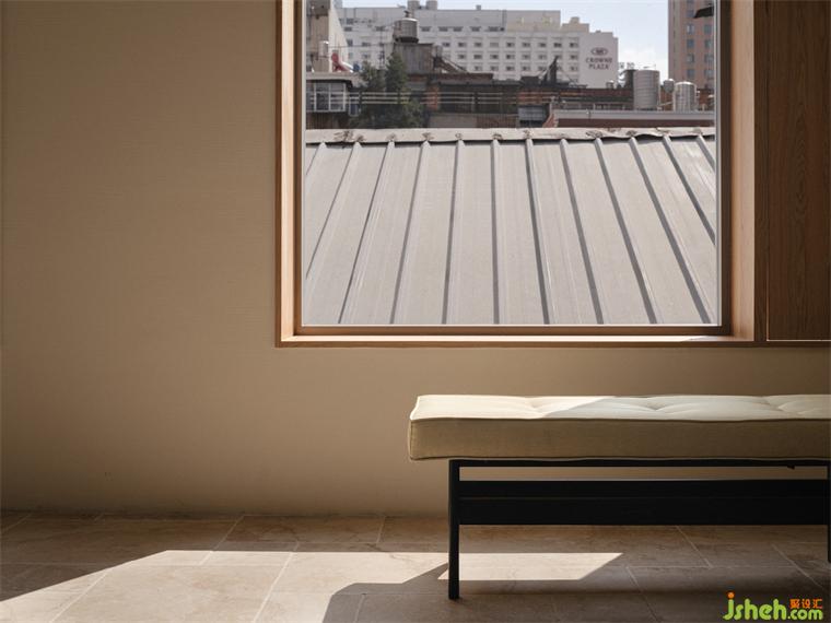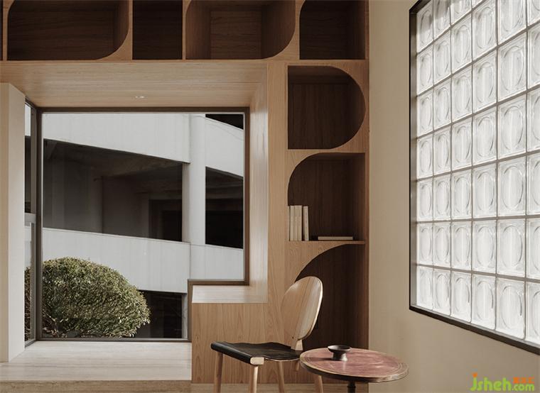設(shè)計(jì)師在三層的設(shè)計(jì)中用了大量的矩形開窗,導(dǎo)入更多的自然光線,辦公室頂部的天窗,明亮但聚焦的光線滿足珠寶辨識的需求;飄窗里直白明麗的光線讓視覺與景觀連接;而南面大面積的玻璃磚,讓正午傾瀉而下的陽光更和煦溫柔;西面的側(cè)窗,光線隱秘而溫和,將攝影室的私密性完整烘托。